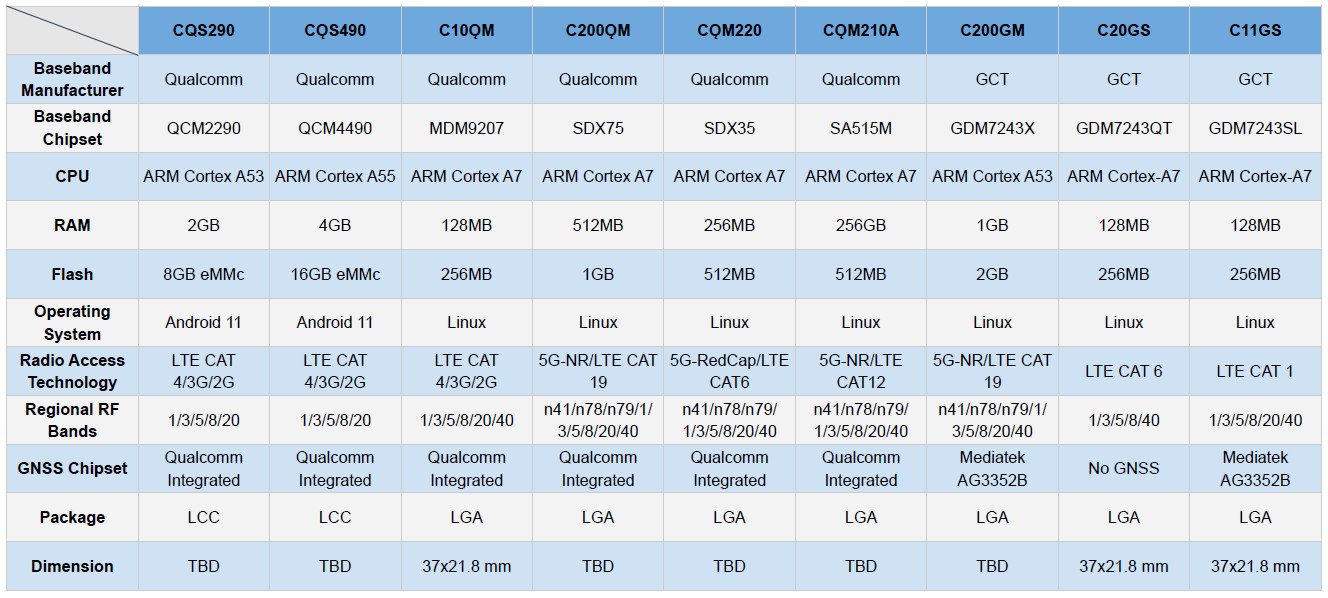- Interfaces: USB2.0, UART, USIM, GPIO, PCM, I2C, ADC, CAN