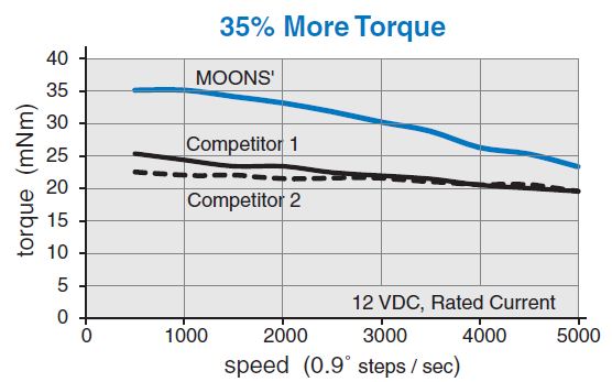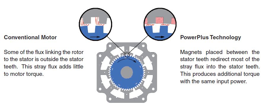 The increased torque is a result of higher motor efficiency, and is available without increasing the drive voltage or current.