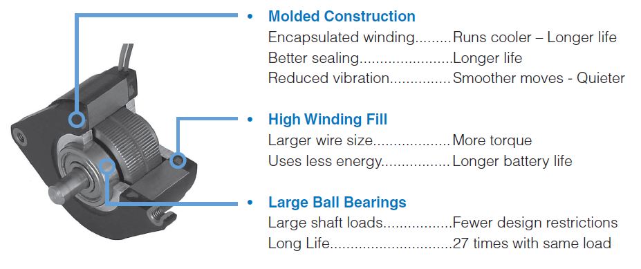 Lower resistance coils allows these encapsulated motors to handle more power. With the same temperature rise the new motors can produce 35% more