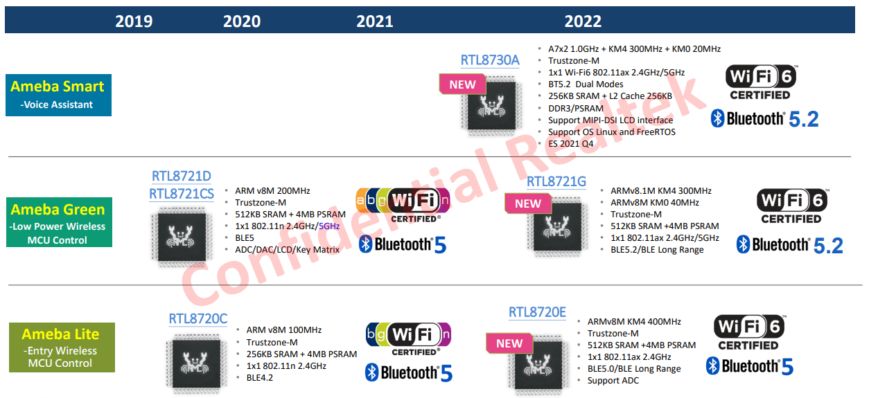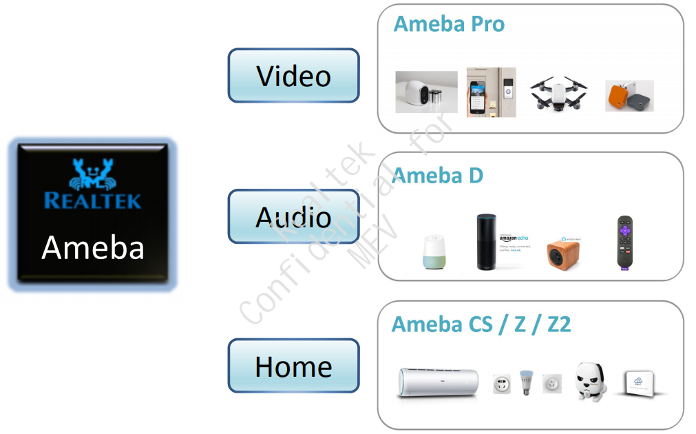 REALTEK AMEBA Family Product range - All WiFi standards from 802.11b up to WiFi6 supported - With and without BT / BLE - Single Chip - Smallest Package - Smallest BOM - Available as Chip and Module: - Lowest Power Consumption - Industrial Temperature Range available Customer and Project have to meet Realtek Project criteria. Please check out the: Contact MEV Line Management for data sheet and ref design. |