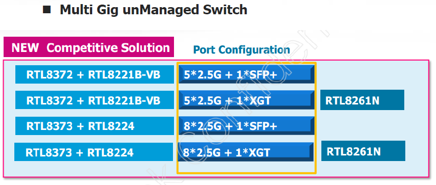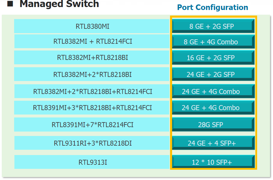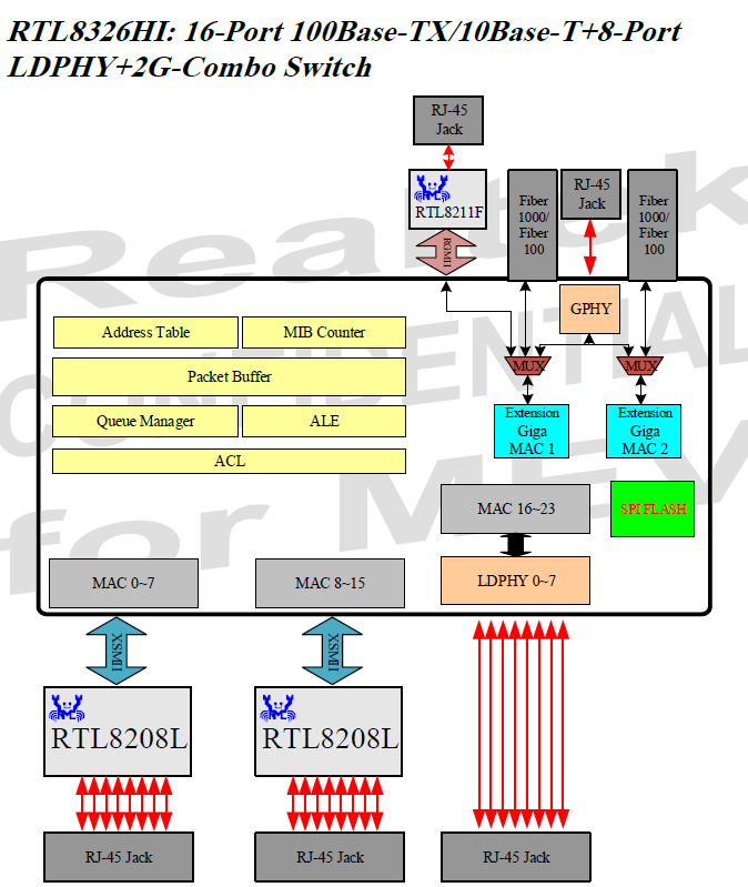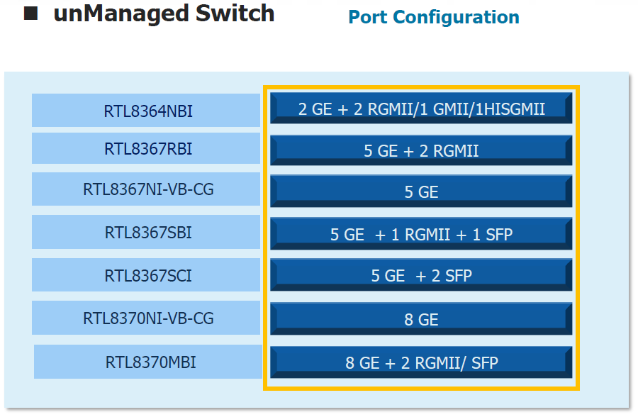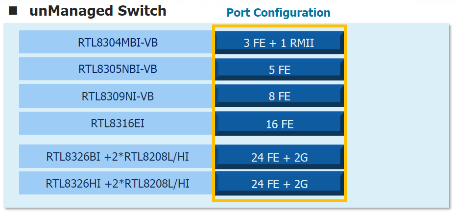 REALTEK Ethernet Switches - 3 / 5 / 8 / 16 / 24 / 48-Port - Stand Alone and Embedded Switches - Integrated PHYs to enable Single Chip Solutions - Fast Ethernet, Gigabit Ethernet, 2.5G, 5G and 10G - Industrial Temperature Range available - Managed Switch and Dumb Switch -Switch Solutions on PCBA level available based on Realtek Chipset Customer and Project have to meet Realtek Project criteria. Please check out the: or the: Contact MEV Line Management for data sheet and ref design. |