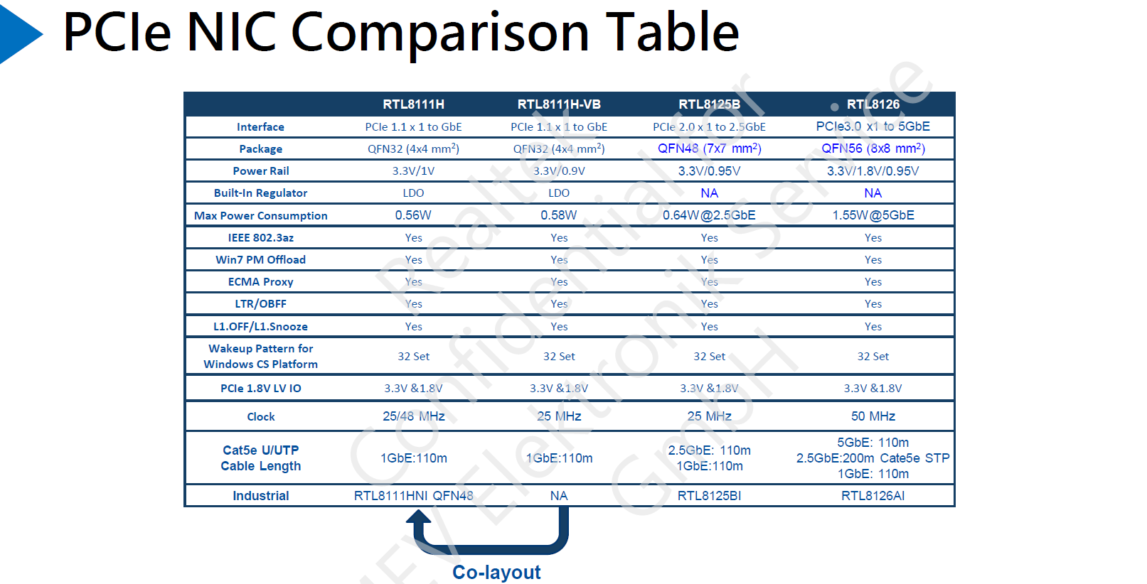 REALTEK Network Interface Controllers (NIC) - PCIe / USB2.0 / USB3.0 - Interface - Lowest Power Consumption - Smallest Package - Smallest BOM - Integrated PHYs - Fast Ethernet, Gigabit Ethernet, 2.5G, 5G and 10G - Industrial Temperature Range available Customer and Project have to meet Realtek Project criteria. Please check out the: Contact MEV Line Management for data sheet and ref design. |
