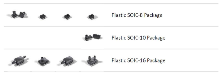 | SM6X91 | 0.3-0.8 PSI | Gauge, Differential, Asymmetric | -20°C to +85°C | SOIC-16 Dual Vertical or Dual Horizontal, SOIC-10 Single Vertical |